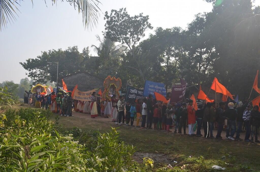 In this village resided the Brahmins, the Kaysthas and various other castes; the Mitra and the Ghose family here however were very ancient and particularly well known. In the temple set up by these two families, even now daily worship and various festivals are observed. Apart from agriculture, this village is very well known for its handloom industry. Like in nearby Rajbalhat, here also beautiful dhotis (male wear) and saris (female wear) are woven. The sellers bring commodities of daily use and agricultural products to the village market held twice a week even now.